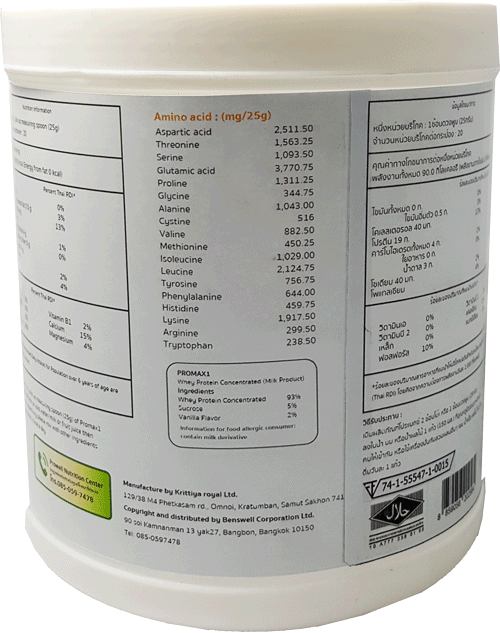 โปรแมกซ์1 ให้ปริมาณโปรตีนสูง แต่มีปริมาณแลคโตสและไขมันต่ำ ไม่เกิน5% จึงไม่เป็นอุปสรรคสำหรับผู้ที่ไม่สามารถทานนมเนื่องจากร่างกายขาดน้ำย่อยแลคโตส และเป็นสารอาหารที่ไม่ทำให้เกิดปัญหาเรื่องน้ำหนักตัวตามมาที่หลัง และโปรแมกซ์ ยังประกอบด้วยแร่ธาตุสำคัญที่จำเป็นต่อร่างกาย ทั้งแร่ธาตุหลัก เช่น แคลเซียม(Ca)สูง แมกนีเซียม(Mg) ฟอสฟอรัส(P) โปแทสซียม(K) และแร่ธาตุรองที่จำเป็น ได้แก่ ธาตุเหล็ก(Fe) สังกะสี(Zn) ทองแดง(Cu) ช่วยสร้างกระดูกและฟัน รวมทั้งมีวิตามิน A, B1, B2 ช่วยสร้างภูมิคุ้มกันให้แก่ร่างกาย
