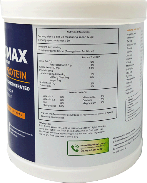 วิธีรับประทาน : เทน้ำธรรมดา-เย็น น้ำผลไม้ 150cc. ลงในแก้ว ตักโปรแมกซ์1 1ช้อนตวงพูน (25กรัม) เทลง แล้วคนให้เข้ากัน ควรรับประทานอย่างน้อยวันละ 1มื้อ เพื่อเพื่อบำรุงสุขภาพ