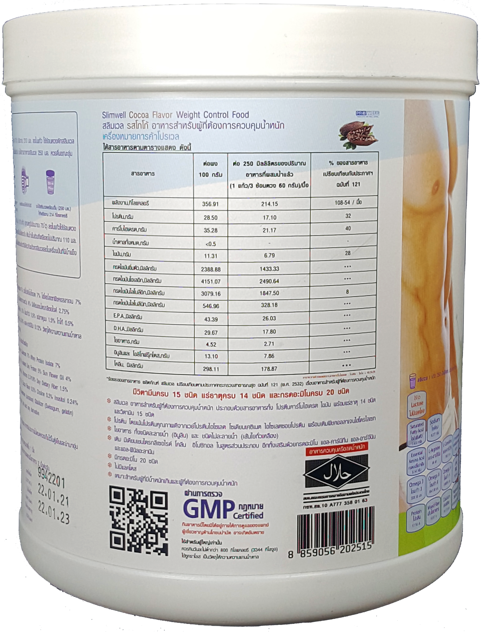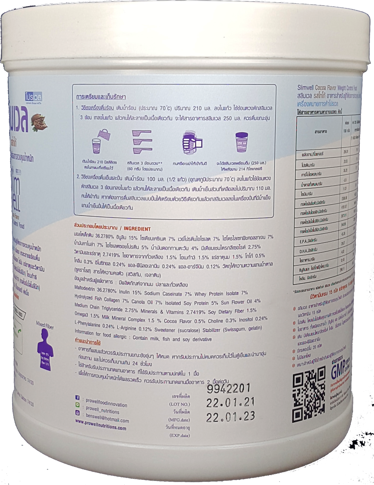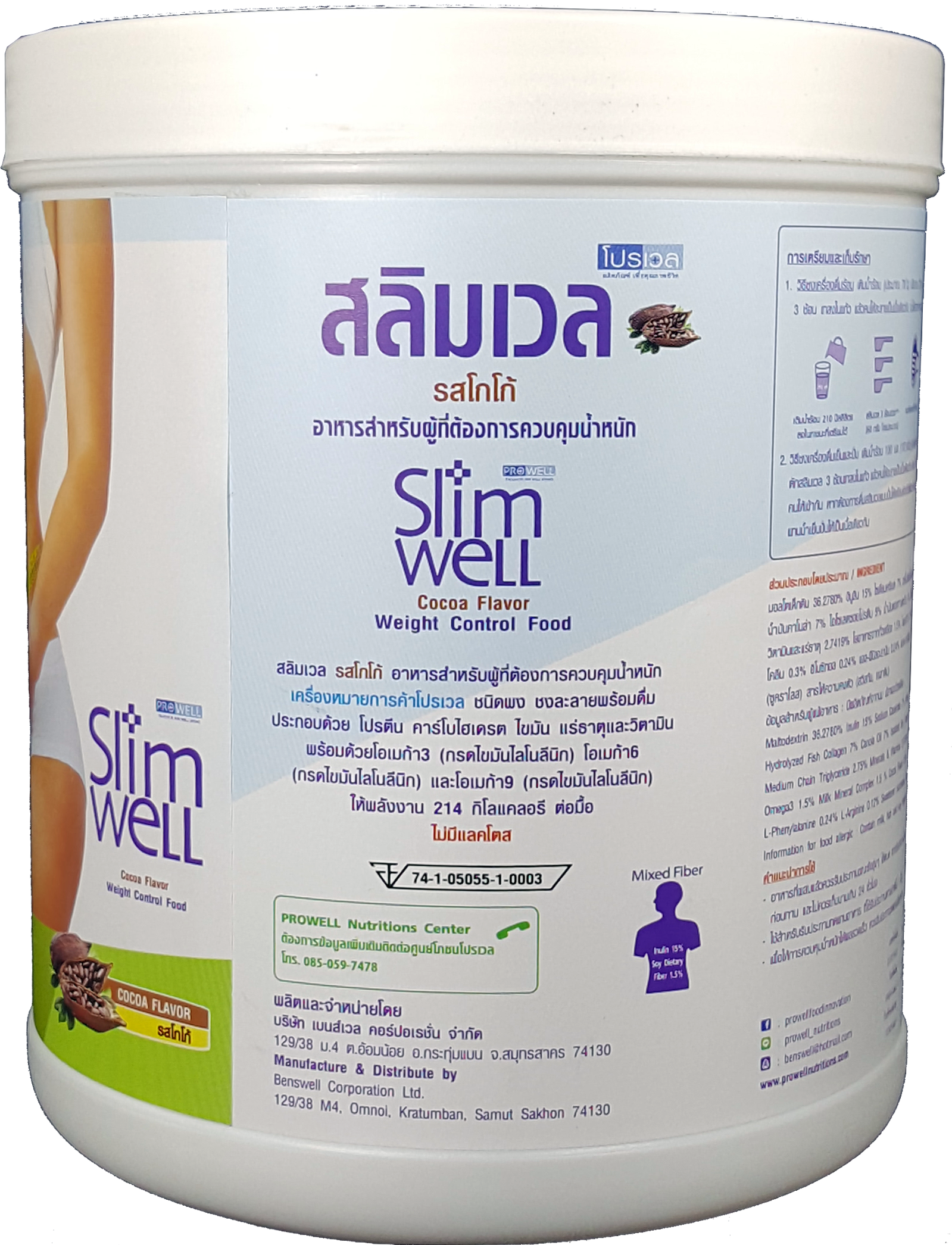 สลิมเวล (Slimwell) อาหารทดแทนมื้ออาหารชนิดผงชงดื่ม เพื่อการควบคุมและลดน้ำหนักภายใต้หลักการทางโภชนาการ ให้พลังงานเพียง 216-218 กิโลแคลลอรี ประกอบด้วยสารอาหารครบทั้ง5หมู่ มีโปรตีนและไฟเบอร์ปริมาณสูง คาร์โบไฮเดรตและไขมันต่ำ โดยเลือกสรรสารอาหารคุณภาพสูง ได้แก่ เวย์สกัดเชิงเดี่ยว(WPI) ไฟเบอร์อินูลิน น้ำมันโอเมก้าครบ 3-6-9 และ MCT คอลลาเจนสกัดจากปลาสูง แคลเซี่ยมจากนม กรดอะมิโนแบบกิ่ง (BCAA). มีวิตามินและแร่ธาตุครบถึง 29ชนิด รวมทั้ง กรดอะมิโนครบทั้ง 20ชนิด และเสริมด้วยสารช่วยเร่งการเผาผลาญสร้างพลังงาน ลดไขมัน ได้แก่ แอล-คาร์นิทีน แอล-เฟนนิลอะลานิน อิโนซิทอล โคลีน ที่ช่วยให้การลดน้ำหนักไปให้ถึงเป้าหมายโดยไม่มีผลเสียต่อร่างกายและปรากฎการโยโย่หลังเลิกรับประทาน ไม่มีน้ำตาล ไม่มีแลคโตส ไม่มีกลูเต้นท์  ขึ้นทะเบียนบัญชีสินด้านวัตกรรมไทย เลขที่ 14000012 (พย. 2560)